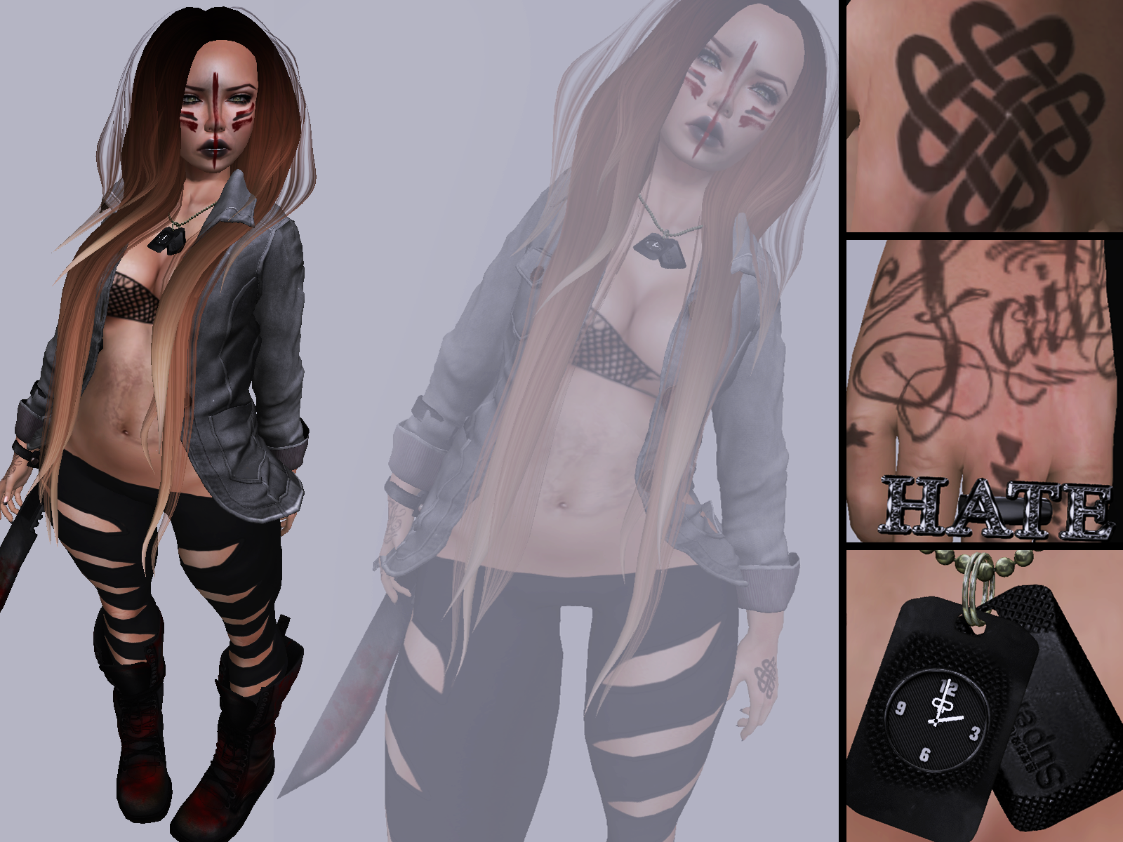 Hi Everyone! Since I spotted the arm blade from DRD, I wanted to use it in a blog post and today's that day. I bring you items from Elska and Diamante. The more I see of Luck of the Irish the more excited I get. These hand tattoos that Elska created are becoming a everyday wear for me. Next we have the Diamante Hate ring from the Kiss and Hate gatcha which will also be at Luck of the Irish. The rings come in different color options and rare includes a hud for colors. So be sure to check these items out when the fair rolls around on the 12th of this month!